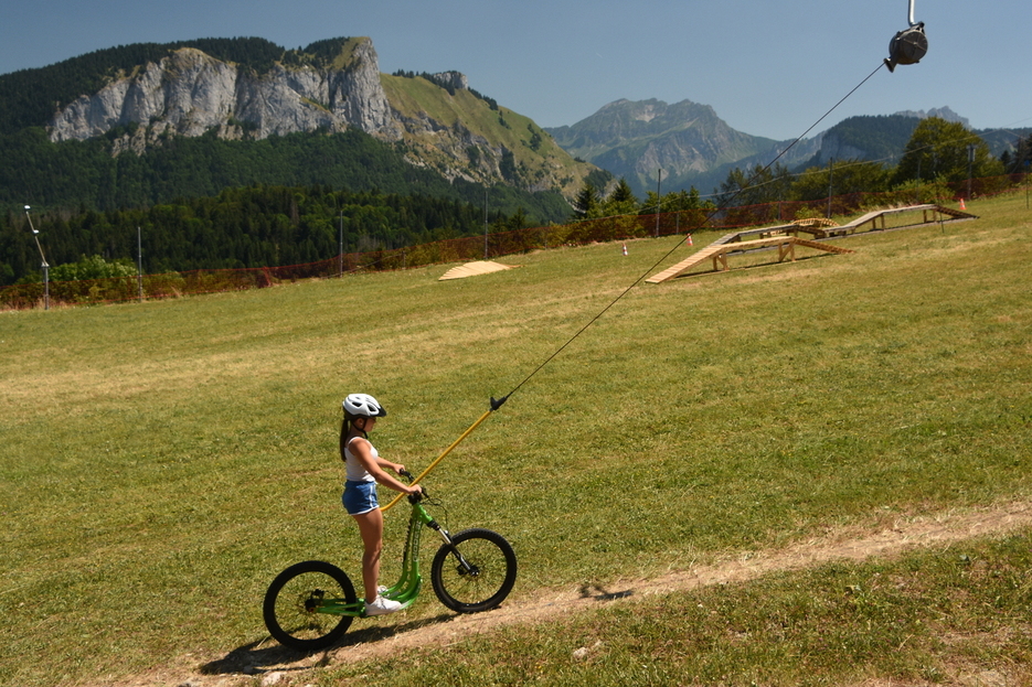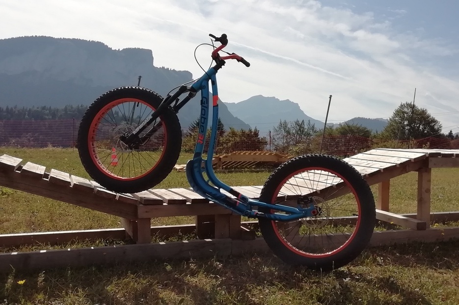 La trottin’ herbe est une trottinette adaptée au milieu montagnard avec de grosses roues.